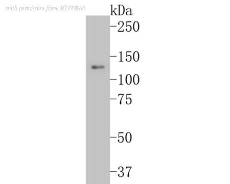 Western blot analysis of Integrin beta 3 on HUVEC cell lysates with Rabbit anti-Integrin beta 3 antibody (ET7110-61) at 1/500 dilution. Lysates/proteins at 10 µg/Lane. Predicted band size: 87 kDa Observed band size:120 kDa Exposure time: 2 minutes; Proteins were transferred to a PVDF membrane and blocked with 5% NFDM/TBST for 1 hour at room temperature. The primary antibody (ET7110-61) at 1/500 dilution was used in 5% NFDM/TBST at room temperature for 2 hours. Goat Anti-Rabbit IgG - HRP Secondary Antibody (HA1001) at 1:5,000 dilution was used for 1 hour at room temperature.