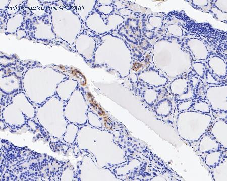 Immunohistochemical analysis of paraffin-embedded human thyroid tissue with Rabbit anti-Integrin beta 3 antibody (ET7110-61) at 1/100 dilution. The section was pre-treated using heat mediated antigen retrieval with Tris-EDTA buffer (pH 8.0-8.4) for 20 minutes. The tissues were blocked in 1% BSA for 20 minutes at room temperature, washed with ddH2O and PBS, and then probed with the primary antibody (ET7110-61) at 1/100 dilution for 1 hour at room temperature. The detection was performed using an HRP conjugated compact polymer system. DAB was used as the chromogen. Tissues were counterstained with hematoxylin and mounted with DPX.