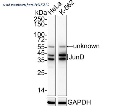 Western blot analysis of JunD on different lysates with Rabbit anti-JunD antibody (ET1612-92) at 1/1,000 dilution. Lane 1: HeLa cell lysate Lane 2: K-562 cell lysate Lysates/proteins at 20 µg/Lane. Predicted band size: 35 kDa Observed band size: 39/42 kDa Exposure time: 1 minute; 4-20% SDS-PAGE gel. Proteins were transferred to a PVDF membrane and blocked with 5% NFDM/TBST for 1 hour at room temperature. The primary antibody (ET1612-92) at 1/1,000 dilution was used in 5% NFDM/TBST at 4℃ overnight. Goat Anti-Rabbit IgG - HRP Secondary Antibody (HA1001) at 1/50,000 dilution was used for 1 hour at room temperature.