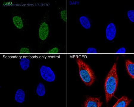 Immunocytochemistry analysis of HeLa cells labeling JunD with Rabbit anti-JunD antibody (ET1612-92) at 1/100 dilution. Cells were fixed in 4% paraformaldehyde for 20 minutes at room temperature, permeabilized with 0.1% Triton X-100 in PBS for 5 minutes at room temperature, then blocked with 1% BSA in 10% negative goat serum for 1 hour at room temperature. Cells were then incubated with Rabbit anti-JunD antibody (ET1612-92) at 1/100 dilution in 1% BSA in PBST overnight at 4 ℃. Goat Anti-Rabbit IgG H&L (iFluor™ 488, HA1121) was used as the secondary antibody at 1/1,000 dilution. PBS instead of the primary antibody was used as the secondary antibody only control. Nuclear DNA was labelled in blue with DAPI. Beta tubulin (M1305-2, red) was stained at 1/100 dilution overnight at +4℃. Goat Anti-Mouse IgG H&L (iFluor™ 594, HA1126) was used as the secondary antibody at 1/1,000 dilution.
