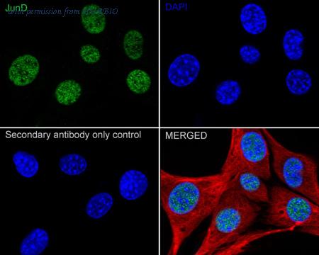 Immunocytochemistry analysis of HeLa cells labeling JunD with Rabbit anti-JunD antibody (HA722913) at 1/100 dilution. Cells were fixed in 4% paraformaldehyde for 15 minutes at room temperature, permeabilized with 0.1% Triton X-100 in PBS for 15 minutes at room temperature, then blocked with 1% BSA in 10% negative goat serum for 1 hour at room temperature. Cells were then incubated with Rabbit anti-JunD antibody (HA722913) at 1/100 dilution in 1% BSA in PBST overnight at 4 ℃. Goat Anti-Rabbit IgG H&L (iFluor™ 488, HA1121) was used as the secondary antibody at 1/1,000 dilution. PBS instead of the primary antibody was used as the secondary antibody only control. Nuclear DNA was labelled in blue with DAPI. Beta tubulin (M1305-2, red) was stained at 1/100 dilution overnight at +4℃. Goat Anti-Mouse IgG H&L (iFluor™ 594, HA1126) was used as the secondary antibody at 1/1,000 dilution.