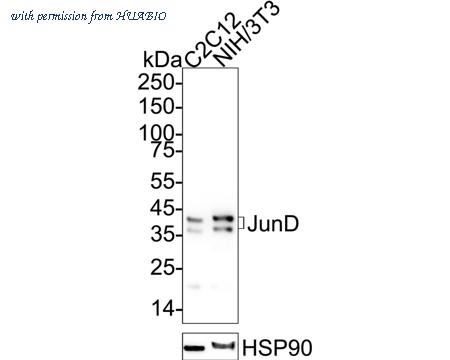 Western blot analysis of JunD on different lysates with Rabbit anti-JunD antibody (HA751250) at 1/5,000 dilution. Lane 1: C2C12 cell lysate Lane 2: NIH/3T3 cell lysate Lysates/proteins at 20 µg/Lane. Predicted band size: 35 kDa Observed band size: 39/42 kDa Exposure time: 3 minutes; ECL: K1801; 4-20% SDS-PAGE gel. Proteins were transferred to a PVDF membrane and blocked with 5% NFDM/TBST for 1 hour at room temperature. The primary antibody (HA751250) at 1/5,000 dilution was used in 5% NFDM/TBST at 4℃ overnight. Goat Anti-Rabbit IgG - HRP Secondary Antibody (HA1001) at 1/50,000 dilution was used for 1 hour at room temperature.
