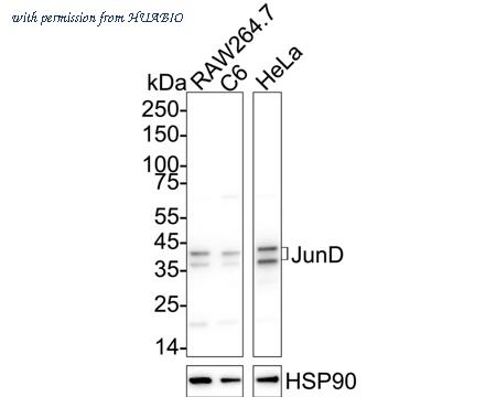Western blot analysis of JunD on different lysates with Rabbit anti-JunD antibody (HA751250) at 1/2,000 dilution. Lane 1: RAW264.7 cell lysate Lane 2: C6 cell lysate Lane 3: HeLa cell lysate Lysates/proteins at 20 µg/Lane. Predicted band size: 35 kDa Observed band size: 39/42 kDa Exposure time: 30 seconds; ECL: K1801; 4-20% SDS-PAGE gel. Proteins were transferred to a PVDF membrane and blocked with 5% NFDM/TBST for 1 hour at room temperature. The primary antibody (HA751250) at 1/2,000 dilution was used in 5% NFDM/TBST at 4℃ overnight. Goat Anti-Rabbit IgG - HRP Secondary Antibody (HA1001) at 1/50,000 dilution was used for 1 hour at room temperature.