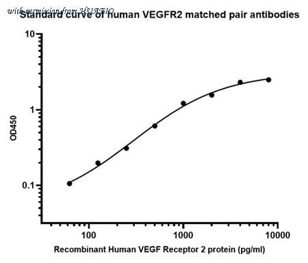 Sandwich ELISA analysis of Human VEGF Receptor 2 matched pair antibodies Capture: HA725121, Human VEGF Receptor 2 Rabbit mAb [PSH12-83] Detector: HA725122, Human VEGF Receptor 2 Rabbit mAb [PSH12-84] Elisa assay was performed by coating wells of a 96-well plate with 100 µl per well of capture antibody (HA725121) diluted in carbonate/bicarbonate buffer, at a concentration of 5 µg/mL overnight at 4℃. Wells of the plate were washed, blocked with 150 µl 0.05% tween-20 1% BSA blocking buffer, and incubated with serial diluted Recombinant Human VEGF Receptor 2 protein (HA211025) starting from 8,000 pg/ml to 0 pg/ml and detect antibody (HA725122, Biotin, 0.2 µg/ml) for 1 hour at 30℃ with shaking. Then the plate was washed and incubated with 100 µl per well of SA-HRP for 0.5 hour at 30℃ with shaking. Detection was performed using an Ultra TMB Substrate for 10 minutes at room temperature in the dark. The reaction was stopped with sulfuric acid and absorbances were read on a spectrophotometer at 450 nm.