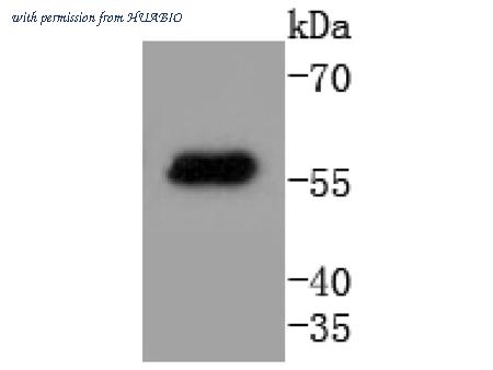 Western blot analysis of Cytokeratin 4 on 293T cell lysates. Proteins were transferred to a PVDF membrane and blocked with 5% BSA in PBS for 1 hour at room temperature. The primary antibody (ET1611-91, 1/500) was used in 5% BSA at room temperature for 2 hours. Goat Anti-Rabbit IgG - HRP Secondary Antibody (HA1001) at 1:5,000 dilution was used for 1 hour at room temperature.