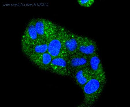 ICC staining of Cytokeratin 4 in Hela cells (green). Formalin fixed cells were permeabilized with 0.1% Triton X-100 in TBS for 10 minutes at room temperature and blocked with 1% Blocker BSA for 15 minutes at room temperature. Cells were probed with the primary antibody (ET1611-91, 1/50) for 1 hour at room temperature, washed with PBS. Alexa Fluor®488 Goat anti-Rabbit IgG was used as the secondary antibody at 1/1,000 dilution. The nuclear counter stain is DAPI (blue).
