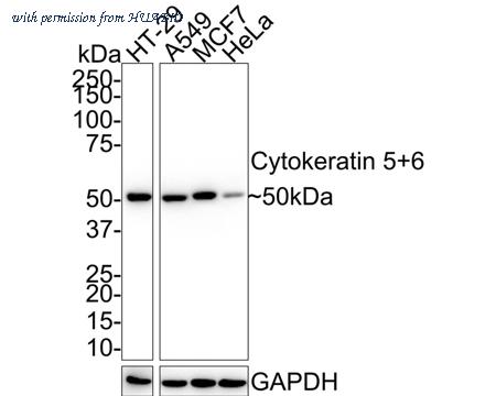 Western blot analysis of Cytokeratin 5+6 on different lysates with Mouse anti-Cytokeratin 5+6 antibody (EM1901-07) at 1/1,000 dilution. Lane 1: HT-29 cell lysate Lane 2: A549 cell lysate Lane 3: MCF7 cell lysate Lane 4: HeLa cell lysate Lysates/proteins at 20 µg/Lane. Predicted band size: 60/62 kDa Observed band size: 50 kDa Exposure time: 24 seconds; ECL: K1801; 4-20% SDS-PAGE gel. Proteins were transferred to a PVDF membrane and blocked with 5% NFDM/TBST for 1 hour at room temperature. The primary antibody (EM1901-07) at 1/1,000 dilution was used in 5% NFDM/TBST at 4℃ overnight. Goat Anti-Mouse IgG - HRP Secondary Antibody (HA1006) at 1/50,000 dilution was used for 1 hour at room temperature.