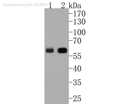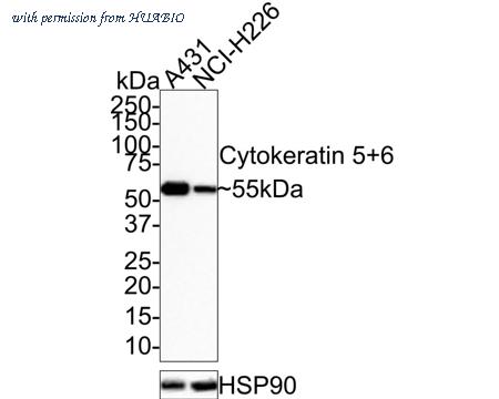 Western blot analysis of Cytokeratin 5+6 on different lysates with Rabbit anti-Cytokeratin 5+6 antibody (HA721456) at 1/1,000 dilution. Lane 1: A431 cell lysate Lane 2: NCI-H226 cell lysate Lysates/proteins at 10 µg/Lane. Predicted band size: 60 kDa Observed band size: 55 kDa Exposure time: 1 minute; 4-20% SDS-PAGE gel. Proteins were transferred to a PVDF membrane and blocked with 5% NFDM/TBST for 1 hour at room temperature. The primary antibody (HA721456) at 1/1,000 dilution was used in 5% NFDM/TBST at room temperature for 2 hours. Goat Anti-Rabbit IgG - HRP Secondary Antibody (HA1001) at 1:100,000 dilution was used for 1 hour at room temperature.