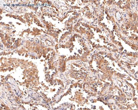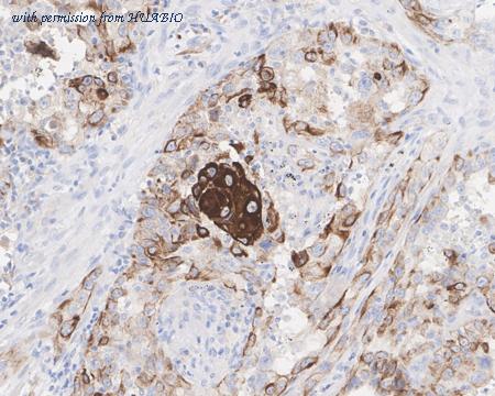 Immunohistochemical analysis of paraffin-embedded human lung adenocarcinoma tissue with Mouse anti-Cytokeratin 5+6 antibody (HA610108) at 1/200 dilution. The section was pre-treated using heat mediated antigen retrieval with Tris-EDTA buffer (pH 9.0) for 20 minutes. The tissues were blocked in 1% BSA for 20 minutes at room temperature, washed with ddH2O and PBS, and then probed with the primary antibody (HA610108) at 1/200 dilution for 1 hour at room temperature. The detection was performed using an HRP conjugated compact polymer system. DAB was used as the chromogen. Tissues were counterstained with hematoxylin and mounted with DPX.