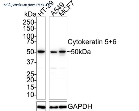 Western blot analysis of Cytokeratin 5+6 on different lysates with Mouse anti-Cytokeratin 5+6 antibody (HA601233) at 1/1,000 dilution. Lane 1: HT-29 cell lysate Lane 2: A549 cell lysate Lane 3: MCF7 cell lysate Lysates/proteins at 20 µg/Lane. Predicted band size: 60/62 kDa Observed band size: 50 kDa Exposure time: 3 minutes; 4-20% SDS-PAGE gel. Proteins were transferred to a PVDF membrane and blocked with 5% NFDM/TBST for 1 hour at room temperature. The primary antibody (HA601233) at 1/1,000 dilution was used in 5% NFDM/TBST at 4℃ overnight. Goat Anti-Mouse IgG - HRP Secondary Antibody (HA1006) at 1/50,000 dilution was used for 1 hour at room temperature.