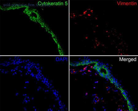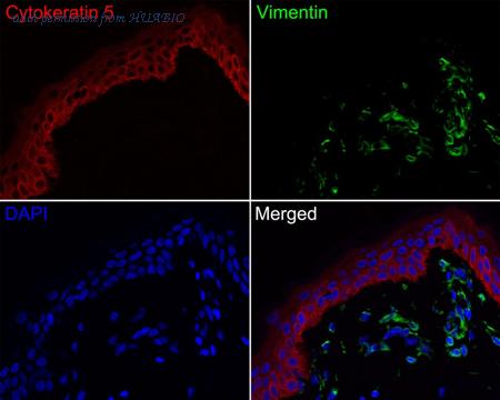 Immunofluorescence analysis of paraffin-embedded human skin tissue labeling Cytokeratin 5 (HA720126F) and Vimentin (EM0401). The section was pre-treated using heat mediated antigen retrieval with Tris-EDTA buffer (pH 9.0) for 20 minutes. The tissues were blocked in 10% negative goat serum for 1 hour at room temperature, washed with PBS. And then probed with the primary antibodies Cytokeratin 5 (HA720126F, red) at 1/50 dilution and Vimentin (EM0401, green) at 1/1,000 dilution overnight at 4 ℃, washed with PBS. iFluor™ 488 conjugate-Goat anti-Mouse IgG (HA1125) was used as the secondary antibody at 1/1,000 dilution. DAPI was used as nuclear counterstain.