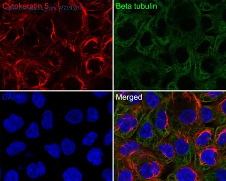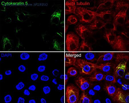 Immunocytochemistry analysis of A431 cells labeling Cytokeratin 5 with Rabbit anti-Cytokeratin 5 antibody (HA720129F) at 1/100 dilution. Cells were fixed in 100% methanol for 10 minutes, permeabilized with 0.1% Triton X-100 in PBS for 15 minutes, and then blocked with 1% BSA for 30 minutes at room temperature. Cells were then incubated with Rabbit anti-Cytokeratin 5 antibody (HA720129F) at 1/100 dilution in 1% BSA overnight at 4 ℃. Nuclear DNA was labelled in blue with DAPI. Beta tubulin (M1305-2, red) was stained at 1/200 dilution overnight at +4℃. Goat Anti-Mouse IgG H&L (iFluor™ 594, HA1126) was used as the secondary antibody at 1/800 dilution.