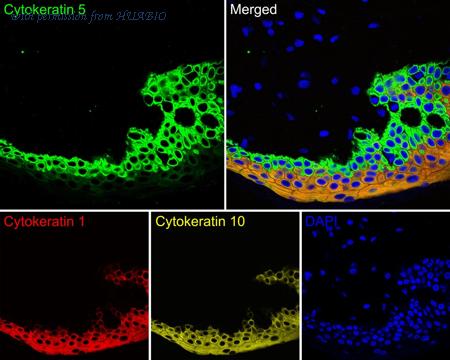 Immunofluorescence analysis of paraffin-embedded human skin tissue labeling Cytokeratin 5 (HA720129F), Cytokeratin 1 (HA720141F) and Cytokeratin 10 (HA720119F). The section was pre-treated using heat mediated antigen retrieval with Tris-EDTA buffer (pH 9.0) for 20 minutes. The tissues were blocked in 10% negative goat serum for 1 hour at room temperature, washed with PBS. And then probed with the primary antibodies Cytokeratin 5 (HA720129F, green) at 1/100 dilution, Cytokeratin 1 (HA720141F, red) at 1/400 dilution and Cytokeratin 10 (HA720119F, yellow) at 1/400 dilution overnight at 4 ℃, washed with PBS. DAPI was used as nuclear counterstain.