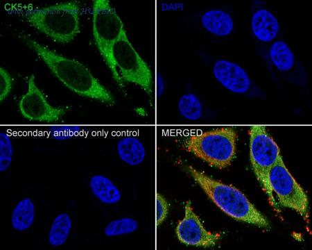 Immunocytochemistry analysis of HeLa cells labeling Cytokeratin 5+6 with Rabbit anti-Cytokeratin 5+6 antibody (HA721456) at 1/100 dilution. Cells were fixed in 4% paraformaldehyde for 10 minutes at 37 ℃, permeabilized with 0.05% Triton X-100 in PBS for 20 minutes, and then blocked with 2% negative goat serum for 30 minutes at room temperature. Cells were then incubated with Rabbit anti-Cytokeratin 5+6 antibody (HA721456) at 1/100 dilution in 2% negative goat serum overnight at 4 ℃. Goat Anti-Rabbit IgG H&L (iFluor™ 488, HA1121) was used as the secondary antibody at 1/1,000 dilution. Nuclear DNA was labelled in blue with DAPI. Beta tubulin (M1305-2, red) was stained at 1/200 dilution overnight at +4℃. Goat Anti-Mouse IgG H&L (iFluor™ 594, HA1126) was used as the secondary antibody at 1/1,000 dilution.