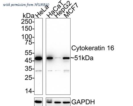 Western blot analysis of Cytokeratin 16 on different lysates with Rabbit anti-Cytokeratin 16 antibody (ET1610-17) at 1/1,000 dilution.