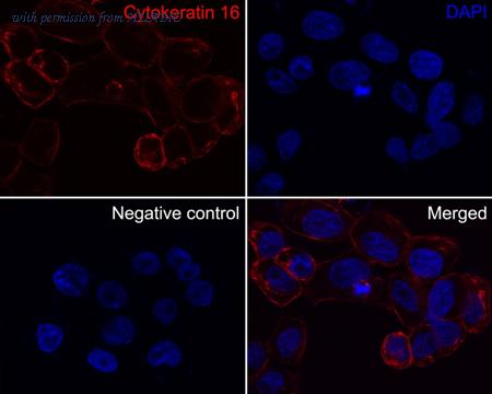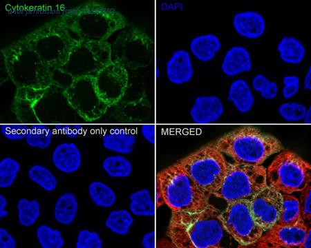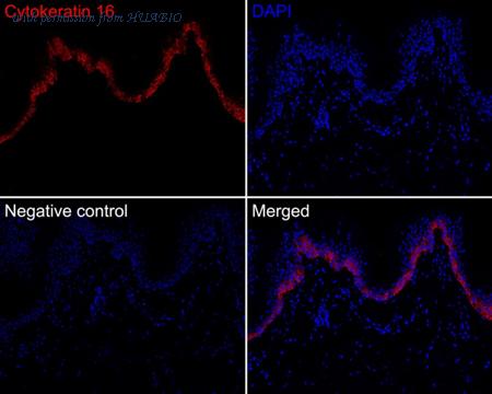 Cells were fixed in 4% paraformaldehyde for 15 minutes at room temperature, permeabilized with 0.1% Triton X-100 in PBS for 15 minutes at room temperature, then blocked with 1% BSA in 10% negative goat serum for 1 hour at room temperature. Cells were then incubated with Rabbit anti-Cytokeratin 16 antibody (ET1610-17) at 1/100 dilution in 1% BSA in PBST overnight at 4 ℃. Goat Anti-Rabbit IgG H&L (iFluor™ 488, HA1121) was used as the secondary antibody at 1/1,000 dilution. PBS instead of the primary antibody was used as the secondary antibody only control. Nuclear DNA was labelled in blue with DAPI.