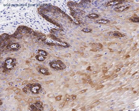 Immunohistochemical analysis of paraffin-embedded human esophagus tissue with Rabbit anti-Cytokeratin 16 antibody (ET1610-17) at 1/1,500 dilution.