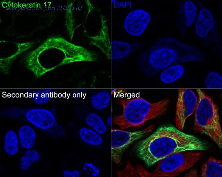 Immunocytochemistry analysis of HeLa cells labeling Cytokeratin 17 with Mouse anti-Cytokeratin 17 antibody (HA601235) at 1/100 dilution. Cells were fixed in 4% paraformaldehyde for 20 minutes at room temperature, permeabilized with 0.1% Triton X-100 in PBS for 5 minutes at room temperature, then blocked with 1% BSA in 10% negative goat serum for 1 hour at room temperature. Cells were then incubated with Mouse anti-Cytokeratin 17 antibody (HA601235) at 1/100 dilution in 1% BSA in PBST overnight at 4 ℃. Goat Anti-Mouse IgG H&L (iFluor™ 488, HA1125) was used as the secondary antibody at 1/1,000 dilution. PBS instead of the primary antibody was used as the secondary antibody only control. Nuclear DNA was labelled in blue with DAPI. beta Tubulin (ET1602-4, red) was stained at 1/100 dilution overnight at +4℃. Goat Anti-Rabbit IgG H&L (iFluor™ 594, HA1122) were used as the secondary antibody at 1/1,000 dilution.