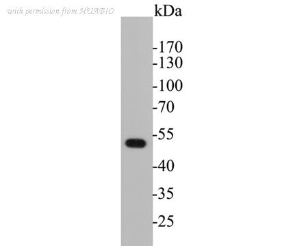 Western blot analysis of Cytokeratin 17 on A431 cell lysates with Rabbit anti-Cytokeratin 17 antibody (HA750031) at 1/2,000 dilution. Lysates/proteins at 15 µg/Lane. Predicted band size: 48 kDa Observed band size: 48 kDa Exposure time: 3 minutes; 4-20% SDS-PAGE gel. Proteins were transferred to a PVDF membrane and blocked with 5% NFDM/TBST for 1 hour at room temperature. The primary antibody (HA750031) at 1/2,000 dilution was used in 5% NFDM/TBST at 4℃ overnight. Goat Anti-Rabbit IgG - HRP Secondary Antibody (HA1001) at 1/50,000 dilution was used for 1 hour at room temperature.