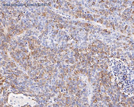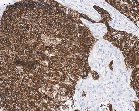 Immunohistochemical analysis of paraffin-embedded human cervical cancer tissue with Mouse anti-Cytokeratin 17 antibody (HA610110) at 1/1,000 dilution. The section was pre-treated using heat mediated antigen retrieval with Tris-EDTA buffer (pH 9.0) for 20 minutes. The tissues were blocked in 1% BSA for 20 minutes at room temperature, washed with ddH2O and PBS, and then probed with the primary antibody (HA610110) at 1/1,000 dilution for 1 hour at room temperature. The detection was performed using an HRP conjugated compact polymer system. DAB was used as the chromogen. Tissues were counterstained with hematoxylin and mounted with DPX.