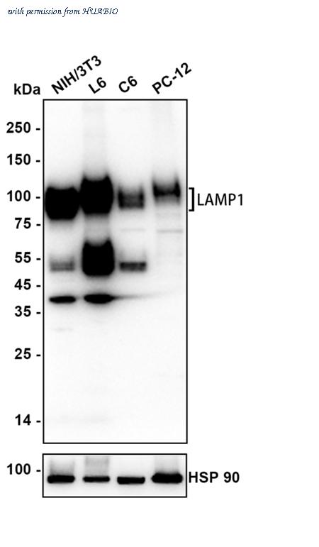Western blot analysis of LAMP1 on different lysates with Rabbit anti-LAMP1 antibody (HA722827) at 1/2,000 dilution. Lane 1: NIH/3T3 cell lysate (15 µg/Lane) Lane 2: L6 cell lysate (15 µg/Lane) Lane 3: C6 cell lysate (15 µg/Lane) Lane 4: PC-12 cell lysate (15 µg/Lane) Predicted band size: 44 kDa Observed band size: 100 kDa Exposure time: 42 seconds; ECL: K1801; 4-20% SDS-PAGE gel. Proteins were transferred to a PVDF membrane and blocked with 5% NFDM/TBST for 1 hour at room temperature. The primary antibody (HA722827) at 1/2,000 dilution was used in 5% NFDM/TBST at 4℃ overnight. Goat Anti-Rabbit IgG - HRP Secondary Antibody (HA1001) at 1/50,000 dilution was used for 1 hour at room temperature.