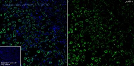 Immunohistochemical analysis of paraffin-embedded human kidney tissue with Rabbit anti-LAMP1 antibody (HA750328) at 1/5,000 dilution. The section was pre-treated using heat mediated antigen retrieval with Tris-EDTA buffer (pH 9.0) for 20 minutes. The tissues were blocked in 1% BSA for 20 minutes at room temperature, washed with ddH2O and PBS, and then probed with the primary antibody (HA750328) at 1/5,000 dilution for 1 hour at room temperature. The detection was performed using an HRP conjugated compact polymer system. DAB was used as the chromogen. Tissues were counterstained with hematoxylin and mounted with DPX.