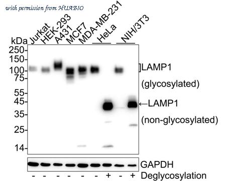 Western blot analysis of LAMP1 on different lysates with Rabbit anti-LAMP1 antibody (HA751160) at 1/2,000 dilution. Lane 1: Jurkat cell lysate Lane 2: HEK-293 cell lysate Lane 3: A431 cell lysate Lane 4: MCF7 cell lysate Lane 5: MDA-MB-231 cell lysate Lane 6: HeLa cell lysate Lane 7: HeLa cell lysate treated with deglycosylation Lane 8: NIH/3T3 cell lysate Lane 9: NIH/3T3 cell lysate treated with deglycosylation Lysates/proteins at 20 µg/Lane. Predicted band size: 44 kDa Observed band size: 120/44 kDa Exposure time: 21 seconds; ECL: K1801; 4-20% SDS-PAGE gel. Proteins were transferred to a PVDF membrane and blocked with 5% NFDM/TBST for 1 hour at room temperature. The primary antibody (HA751160) at 1/2,000 dilution was used in 5% NFDM/TBST at 4℃ overnight. Goat Anti-Rabbit IgG - HRP Secondary Antibody (HA1001) at 1/50,000 dilution was used for 1 hour at room temperature.