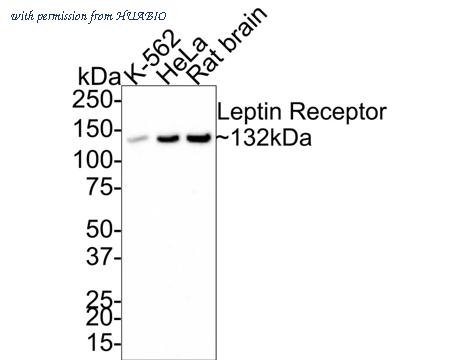 Western blot analysis of Leptin Receptor on different lysates with Rabbit anti-Leptin Receptor antibody (HA750413) at 1/1,000 dilution. Lane 1: K-562 cell lysate (16 µg/Lane) Lane 2: HeLa cell lysate (20 µg/Lane) Lane 3: Rat brain tissue lysate (32 µg/Lane) Predicted band size: 132 kDa Observed band size: 132 kDa Exposure time: 3 minutes; 4-20% SDS-PAGE gel. Proteins were transferred to a PVDF membrane and blocked with 5% NFDM/TBST for 1 hour at room temperature. The primary antibody (HA750413) at 1/1,000 dilution was used in 5% NFDM/TBST at room temperature for 2 hours. Goat Anti-Rabbit IgG - HRP Secondary Antibody (HA1001) at 1:200,000 dilution was used for 1 hour at room temperature.