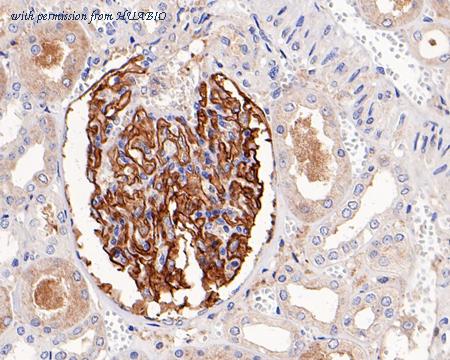 Immunohistochemical analysis of paraffin-embedded human kidney tissue with Rabbit anti-Leptin Receptor antibody (ET1704-44) at 1/1,000 dilution. The section was pre-treated using heat mediated antigen retrieval with Tris-EDTA buffer (pH 9.0) for 20 minutes. The tissues were blocked in 1% BSA for 20 minutes at room temperature, washed with ddH2O and PBS, and then probed with the primary antibody (ET1704-44) at 1/1,000 dilution for 1 hour at room temperature. The detection was performed using an HRP conjugated compact polymer system. DAB was used as the chromogen. Tissues were counterstained with hematoxylin and mounted with DPX.