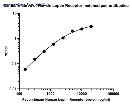 Sandwich ELISA analysis of human Leptin Receptor matched pair antibodies Capture: HA725058, Human Leptin Receptor Rabbit mAb [PSH14-71] Detector: HA725059, Human Leptin Receptor Rabbit mAb [PSH14-72] Elisa assay was performed by coating wells of a 96-well plate with 50 µl per well of capture antibody (HA725058) diluted in carbonate/bicarbonate buffer, at a concentration of5µg/ml overnight at 4℃. Wells of the plate were washed, blocked with 150 µl 0.05% tween-20 1% BSA blocking buffer, and incubated with serial diluted Recombinant Human Leptin Receptor protein (HA211148) starting from 20,000 pg/ml to 0 pg/ml and detect antibody (HA725059, Biotin, 0.2 µg/ml) for 1 hour at 30℃ with shaking. Then the plate was washed and incubated with 50 µl per well of SA-HRP for 0.5 hour at 30℃ with shaking. Detection was performed using an Ultra TMB Substrate for 10 minutes at room temperature in the dark. The reaction was stopped with sulfuric acid and absorbances were read on a spectrophotometer at 450 nm.