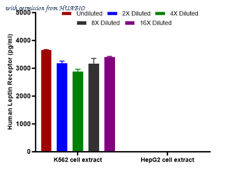 Interpolated concentrations of native Leptin Receptor in K562 and HepG2 extract samples based on a 1,000 µg/ml extract load. Capture: HA725058, Human Leptin Receptor Rabbit mAb [PSH14-71] Detector: HA725059, Human Leptin Receptor Rabbit mAb [PSH14-72] The concentrations of Leptin Receptor were measured in duplicates, interpolated from the Leptin Receptor standard curve and corrected for sample dilution. Undiluted samples are K562 extract 50% and HepG2 extract 100%. The interpolated dilution factor corrected values are plotted (mean +/- SD, n=2). The mean Leptin Receptor concentration was determined to be 3,255 pg/ml in K562 extract and undetectable in HepG2 extract.