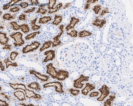 Immunohistochemical analysis of paraffin-embedded human kidney tissue with Rabbit anti-Lrp2 / Megalin antibody (HA750959) at 1/1,000 dilution. The section was pre-treated using heat mediated antigen retrieval with Tris-EDTA buffer (pH 9.0) for 20 minutes. The tissues were blocked in 1% BSA for 20 minutes at room temperature, washed with ddH2O and PBS, and then probed with the primary antibody (HA750959) at 1/1,000 dilution for 1 hour at room temperature. The detection was performed using an HRP conjugated compact polymer system. DAB was used as the chromogen. Tissues were counterstained with hematoxylin and mounted with DPX.