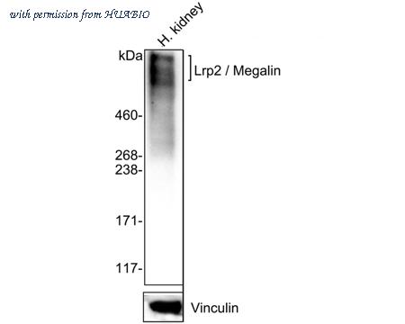 Western blot analysis of Lrp2 / Megalin on human kidney tissue lysates with Rabbit anti-Lrp2 / Megalin antibody (HA721910) at 1/2,000 dilution. Lysates/proteins at 40 µg/Lane. Predicted band size: 522 kDa Observed band size: 600 kDa Exposure time: 2 minutes; 4-20% SDS-PAGE gel. Proteins were transferred to a PVDF membrane and blocked with 5% NFDM/TBST for 1 hour at room temperature. The primary antibody (HA721910) at 1/2,000 dilution was used in 5% NFDM/TBST at 4℃ overnight. Goat Anti-Rabbit IgG - HRP Secondary Antibody (HA1001) at 1/50,000 dilution was used for 1 hour at room temperature.