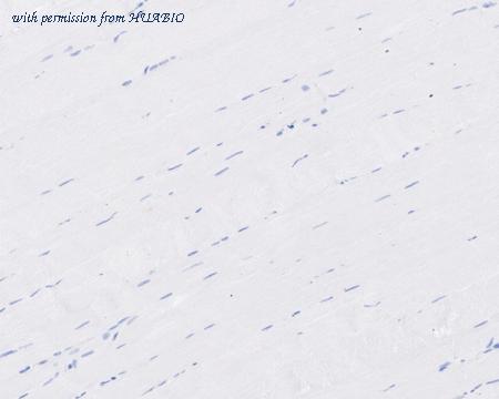 Immunohistochemical analysis of paraffin-embedded human skeletal muscle tissue (negative) with Rabbit anti-Lrp2 / Megalin antibody (HA721910) at 1/1000 dilution. The section was pre-treated using heat mediated antigen retrieval with Tris-EDTA buffer (pH 9.0) for 20 minutes. The tissues were blocked in 1% BSA for 20 minutes at room temperature, washed with ddH2O and PBS, and then probed with the primary antibody (HA721910) at 1/200 dilution for 1 hour at room temperature. The detection was performed using an HRP conjugated compact polymer system. DAB was used as the chromogen. Tissues were counterstained with hematoxylin and mounted with DPX.