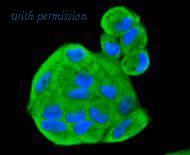 ICC staining of Smad1 in MCF-7 cells (green). Formalin fixed cells were permeabilized with 0.1% Triton X-100 in TBS for 10 minutes at room temperature and blocked with 10% negative goat serum for 15 minutes at room temperature. Cells were probed with the primary antibody (ET1612-39, 1/50) for 1 hour at room temperature, washed with PBS. Alexa Fluor®488 conjugate-Goat anti-Rabbit IgG was used as the secondary antibody at 1/1,000 dilution. The nuclear counter stain is DAPI (blue).