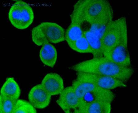 ICC staining of Smad1 in PANC-1 cells (green). Formalin fixed cells were permeabilized with 0.1% Triton X-100 in TBS for 10 minutes at room temperature and blocked with 1% Blocker BSA for 15 minutes at room temperature. Cells were probed with the primary antibody (HA750124, 1/50) for 1 hour at room temperature, washed with PBS. Alexa Fluor®488 Goat anti-Rabbit IgG was used as the secondary antibody at 1/1,000 dilution. The nuclear counter stain is DAPI (blue).