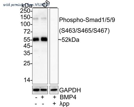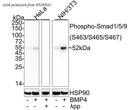 Western blot analysis of Phospho-Smad1/5/9 (S463/S465/S467) on different lysates with Rabbit anti-Phospho-Smad1/5/9 (S463/S465/S467) antibody (HA722566) at 1/1,000 dilution. Lane 1: HeLa cell lysate Lane 2: HeLa treated with 10ng/mL BMP4 for 1 hour cell lysate Lane 3: HeLa treated with 10ng/mL BMP4 for 1 hour cell lysate, then the membrane treated with λpp for 1 hour Lane 4: NIH/3T3 cell lysate Lane 5: NIH/3T3 treated with 10ng/mL BMP4 for 1 hour cell lysate Lysates/proteins at 20 µg/Lane. Predicted band size: 52 kDa Observed band size: 52 kDa Exposure time: Lane 1-3: 3 minutes; Lane 4-5: 42 seconds; ECL: K1801; 4-20% SDS-PAGE gel. Proteins were transferred to a PVDF membrane and blocked with 5% NFDM/TBST for 1 hour at room temperature. The primary antibody (HA722566) at 1/1,000 dilution was used in 5% NFDM/TBST at 4℃ overnight. Goat Anti-Rabbit IgG - HRP Secondary Antibody (HA1001) at 1/50,000 dilution was used for 1 hour at room temperature.
