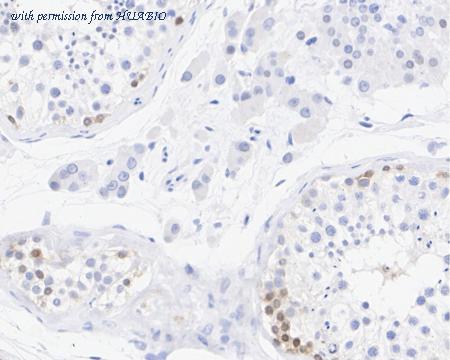 Immunohistochemical analysis of paraffin-embedded human testis tissue with Rabbit anti-Phospho-Smad1/5/9 (S463/S465/S467) antibody (HA722566) at 1/1,000 dilution. The section was pre-treated using heat mediated antigen retrieval with sodium citrate buffer (pH 6.0) (high pressure) for 2 minutes. The tissues were blocked in 1% BSA for 20 minutes at room temperature, washed with ddH2O and PBS, and then probed with the primary antibody (HA722566) at 1/1,000 dilution for 1 hour at room temperature. The detection was performed using an HRP conjugated compact polymer system. DAB was used as the chromogen. Tissues were counterstained with hematoxylin and mounted with DPX.