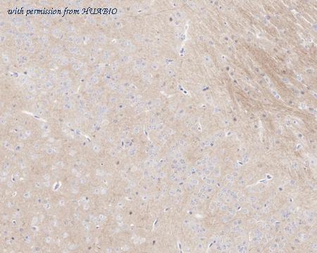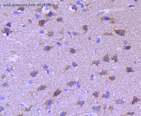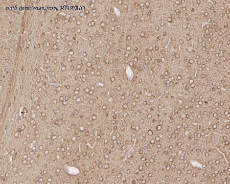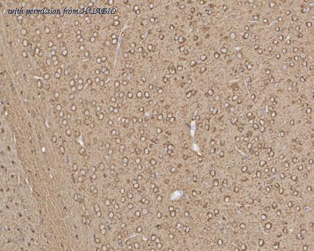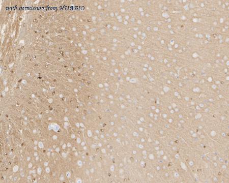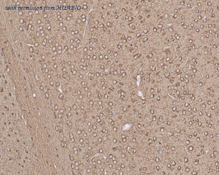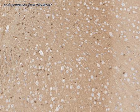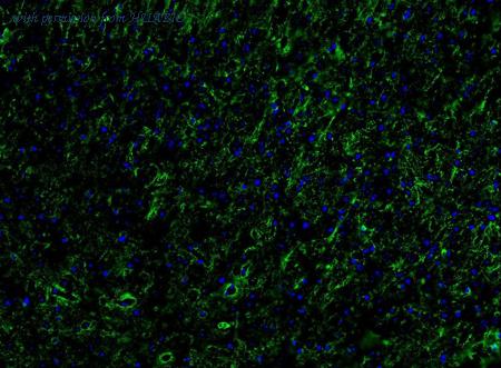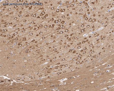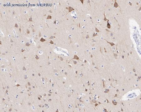 Application: IHC-Fr Species: Rat Site: Cerebral cortex Sample: Frozen section Antibody concentration: 1/500 Antigen retrieval: The section was pre-treated using heat mediated antigen retrieval with sodium citrate buffer (pH 6.0) for about 2 minutes in microwave oven.