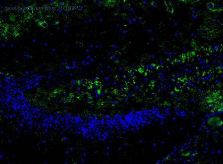 Immunofluorescence analysis of frozen mouse hippocampus tissue labeling Tau with Rabbit anti-Tau antibody (ET1603-2). The tissues were blocked in 3% BSA for 30 minutes at room temperature, washed with PBS, and then probed with the primary antibody (ET1603-2, green) at 1/50 dilution overnight at 4℃, washed with PBS. Goat Anti-Rabbit IgG H&L (Alexa Fluor® 488) was used as the secondary antibody at 1/200 dilution. Nuclei were counterstained with DAPI (blue). Image acquisition was performed with KFBIO KF-FL-400 Scanner.