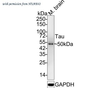Western blot analysis of Tau on mouse brain tissue lysates with Rabbit anti-Tau antibody (ET1603-2) at 1/2,000 dilution. Lysates/proteins at 20 µg/Lane. Predicted band size: 79 kDa Observed band size: 50 kDa Exposure time: 3 minutes 49 seconds; 4-20% SDS-PAGE gel. Proteins were transferred to a PVDF membrane and blocked with 5% NFDM/TBST for 1 hour at room temperature. The primary antibody (ET1603-2) at 1/2,000 dilution was used in 5% NFDM/TBST at 4℃ overnight. Goat Anti-Rabbit IgG - HRP Secondary Antibody (HA1001) at 1/50,000 dilution was used for 1 hour at room temperature.