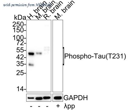 Western blot analysis of Phospho-Tau (T231) on different lysates with Rabbit anti-Phospho-Tau (T231) antibody (ET1610-31) at 1/2,000 dilution. Lane 1: Human brain tissue lysate Lane 2: Mouse brain tissue lysate Lane 3: Rat brain tissue lysate Lane 4: Mouse brain treated with λpp for 1 hour tissue lysate Lysates/proteins at 20 µg/Lane. Predicted band size: 46 kDa Observed band size: 35-70 kDa Exposure time: 3 minutes; 4-20% SDS-PAGE gel. Proteins were transferred to a PVDF membrane and blocked with 5% NFDM/TBST for 1 hour at room temperature. The primary antibody (ET1610-31) at 1/2,000 dilution was used in 5% NFDM/TBST at 4℃ overnight. Goat Anti-Rabbit IgG - HRP Secondary Antibody (HA1001) at 1/50,000 dilution was used for 1 hour at room temperature.