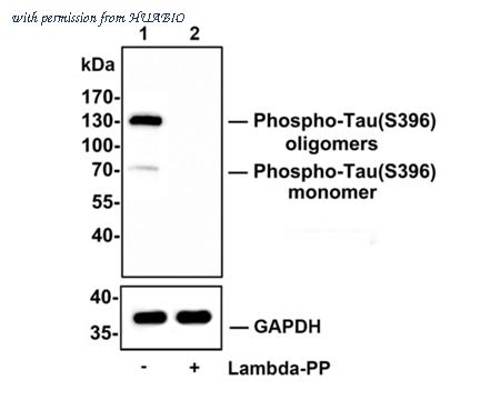 Western blot analysis of Phospho-Tau(S396) on SHSY5Y cell lysates. Lane 1: SHSY5Y cells, whole cell lysate, 10ug/lane Lane 2: SHSY5Y cells treated with 2.8ug/ul lambda-PP for 30 minutes, whole cell lysates, 10ug/lane All lanes : Anti-Phospho-Tau(S396) antibody (ET1611-68) at 1/500 dilution. Anti-GAPDH antibody (ET1601-4) at 1/10,000 dilution. Goat Anti-Rabbit IgG H&L (HRP) (HA1001) at 1/200,000 dilution. Predicted band size: 79 kDa Observed band size: 70/130 kDa Blocking and diluting buffer: 5% BSA. Exposure time: 2 minutes 34 seconds