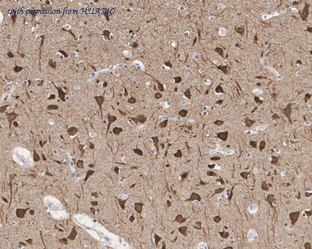 Immunohistochemical analysis of paraffin-embedded human brain tissue with Rabbit anti-Phospho-Tau (T231) antibody (HA721569) at 1/10,000 dilution. The section was pre-treated using heat mediated antigen retrieval with Tris-EDTA buffer (pH 9.0) for 20 minutes. The tissues were blocked in 1% BSA for 20 minutes at room temperature, washed with ddH2O and PBS, and then probed with the primary antibody (HA721569) at 1/10,000 dilution for 1 hour at room temperature. The detection was performed using an HRP conjugated compact polymer system. DAB was used as the chromogen. Tissues were counterstained with hematoxylin and mounted with DPX.