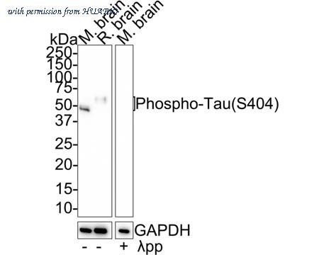 Western blot analysis of Phospho-Tau (S404) on different lysates with Rabbit anti-Phospho-Tau (S404) antibody (HA721665) at 1/2,000 dilution. Lane 1: Mouse brain tissue lysate Lane 2: Rat brain tissue lysate Lane 3: Mouse brain tissue lysate, the membrane treated with λpp for 1 hour Lysates/proteins at 30 µg/Lane. Predicted band size: 79 kDa Observed band size: 45-70 kDa Exposure time: 3 minutes; 4-20% SDS-PAGE gel. Proteins were transferred to a PVDF membrane and blocked with 5% NFDM/TBST for 1 hour at room temperature. The primary antibody (HA721665) at 1/2,000 dilution was used in 5% NFDM/TBST at 4℃ overnight. Goat Anti-Rabbit IgG - HRP Secondary Antibody (HA1001) at 1/50,000 dilution was used for 1 hour at room temperature.