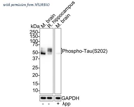 Western blot analysis of Phospho-Tau (S202) on different lysates with Rabbit anti-Phospho-Tau (S202) antibody (HA721666) at 1/2,000 dilution. Lane 1: Mouse brain tissue lysate Lane 2: Rat hippocampus tissue lysate Lane 3: Mouse brain treated with λpp for 1 hour tissue lysate Lysates/proteins at 30 µg/Lane. Predicted band size: 79 kDa Observed band size: 45-70 kDa Exposure time: 1 minute 2 seconds; 4-20% SDS-PAGE gel. Proteins were transferred to a PVDF membrane and blocked with 5% NFDM/TBST for 1 hour at room temperature. The primary antibody (HA721666) at 1/2,000 dilution was used in 5% NFDM/TBST at 4℃ overnight. Goat Anti-Rabbit IgG - HRP Secondary Antibody (HA1001) at 1/50,000 dilution was used for 1 hour at room temperature.