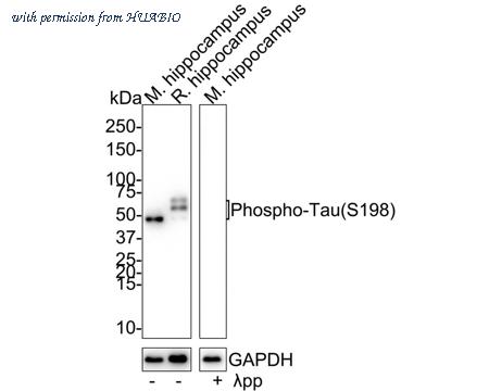 Western blot analysis of Phospho-Tau (S198) on different lysates with Rabbit anti-Phospho-Tau (S198) antibody (HA721668) at 1/2,000 dilution. Lane 1: Mouse hippocampus tissue lysate Lane 2: Rat hippocampus tissue lysate Lane 3: Mouse hippocampus treated with λpp for 1 hour tissue lysate Lysates/proteins at 30 µg/Lane. Predicted band size: 79 kDa Observed band size: 45-70 kDa Exposure time: 5 minutes; 4-20% SDS-PAGE gel. Proteins were transferred to a PVDF membrane and blocked with 5% NFDM/TBST for 1 hour at room temperature. The primary antibody (HA721668) at 1/2,000 dilution was used in 5% NFDM/TBST at 4℃ overnight. Goat Anti-Rabbit IgG - HRP Secondary Antibody (HA1001) at 1/50,000 dilution was used for 1 hour at room temperature.