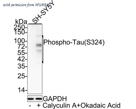 Western blot analysis of Phospho-Tau (S324) on different lysates with Rabbit anti-Phospho-Tau (S324) antibody (HA721798) at 1/1,000 dilution. Lane 1: SH-SY5Y cell lysate Lane 2: SH-SY5Y treated with 200nM Calyculin A and 1μM Okadaic Acid for 1 hour cell lysate Lysates/proteins at 20 µg/Lane. Predicted band size: 79 kDa Observed band size: 35-130 kDa Exposure time: 1 minute; 4-20% SDS-PAGE gel. Proteins were transferred to a PVDF membrane and blocked with 5% NFDM/TBST for 1 hour at room temperature. The primary antibody (HA721798) at 1/1,000 dilution was used in 5% NFDM/TBST at 4℃ overnight. Goat Anti-Rabbit IgG - HRP Secondary Antibody (HA1001) at 1/50,000 dilution was used for 1 hour at room temperature.
