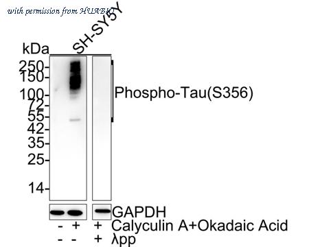 Western blot analysis of Phospho-Tau (S356) on different lysates with Rabbit anti-Phospho-Tau (S356) antibody (HA721799) at 1/1,000 dilution. Lane 1: SH-SY5Y cell lysate Lane 2: SH-SY5Y treated with 200nM Calyculin A and 1μM Okadaic Acid for 1 hour cell lysate Lane 3: SH-SY5Y treated with 200nM Calyculin A and 1μM Okadaic Acid for 1 hour, then treated with λpp for 1 hour cell lysate Lysates/proteins at 20 µg/Lane. Predicted band size: 79 kDa Observed band size: 50-250 kDa Exposure time: 3 minutes 19 seconds; 4-20% SDS-PAGE gel. Proteins were transferred to a PVDF membrane and blocked with 5% NFDM/TBST for 1 hour at room temperature. The primary antibody (HA721799) at 1/1,000 dilution was used in 5% NFDM/TBST at 4℃ overnight. Goat Anti-Rabbit IgG - HRP Secondary Antibody (HA1001) at 1/50,000 dilution was used for 1 hour at room temperature.