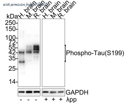 Western blot analysis of Phospho-Tau (S199) on different lysates with Rabbit anti-Phospho-Tau (S199) antibody (HA721800) at 1/1,000 dilution. Lane 1: Human brain tissue lysate Lane 2: Mouse brain tissue lysate Lane 3: Rat brain tissue lysate Lane 4: Human brain tissue lysate, the membrane treated with λpp for 1 hour Lane 5: Mouse brain tissue lysate, the membrane treated with λpp for 1 hour Lane 6: Rat brain tissue lysate, the membrane treated with λpp for 1 hour Lysates/proteins at 20 µg/Lane. Predicted band size: 79 kDa Observed band size: 35-70 kDa Exposure time: 3 seconds; 4-20% SDS-PAGE gel. Proteins were transferred to a PVDF membrane and blocked with 5% NFDM/TBST for 1 hour at room temperature. The primary antibody (HA721800) at 1/1,000 dilution was used in 5% NFDM/TBST at 4℃ overnight. Goat Anti-Rabbit IgG - HRP Secondary Antibody (HA1001) at 1/50,000 dilution was used for 1 hour at room temperature.